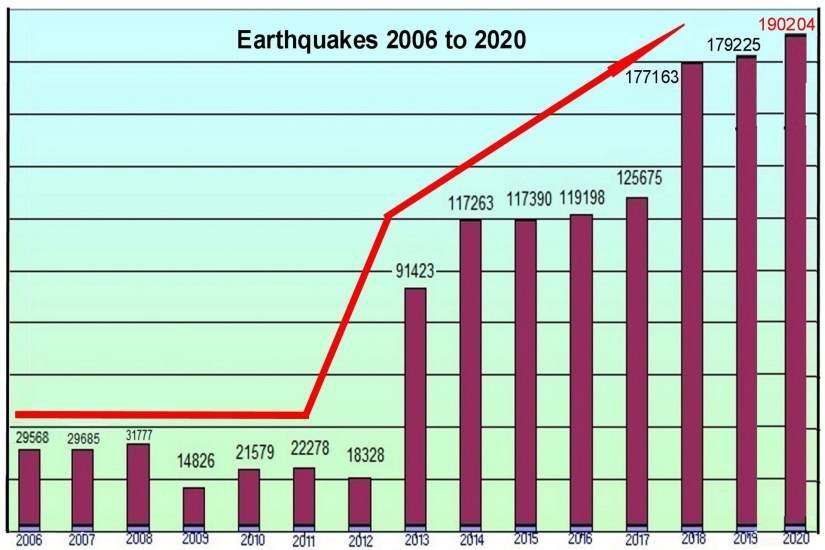 The total number of earthquakes (190204) are 7.4 times the average (25721 from 2000 to 2012) and over 10.38 times the amount in 2012 (18328). As of December 31, 2020, the numbers are: