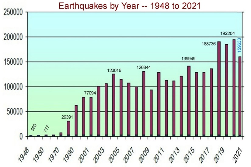 The total number of earthquakes (159633) are 11.25 times the average (14194 from 1900 to 2000) and over 279 times the amount in 1949 (571). As of December 31, 2021, the numbers are: