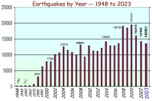 The total number of earthquakes (145961) are 10.28 times the average (14194 from 1900 to 2000) and still over 255.6 times the amount in 1949 (571). As of December 31, 2023, the numbers are: