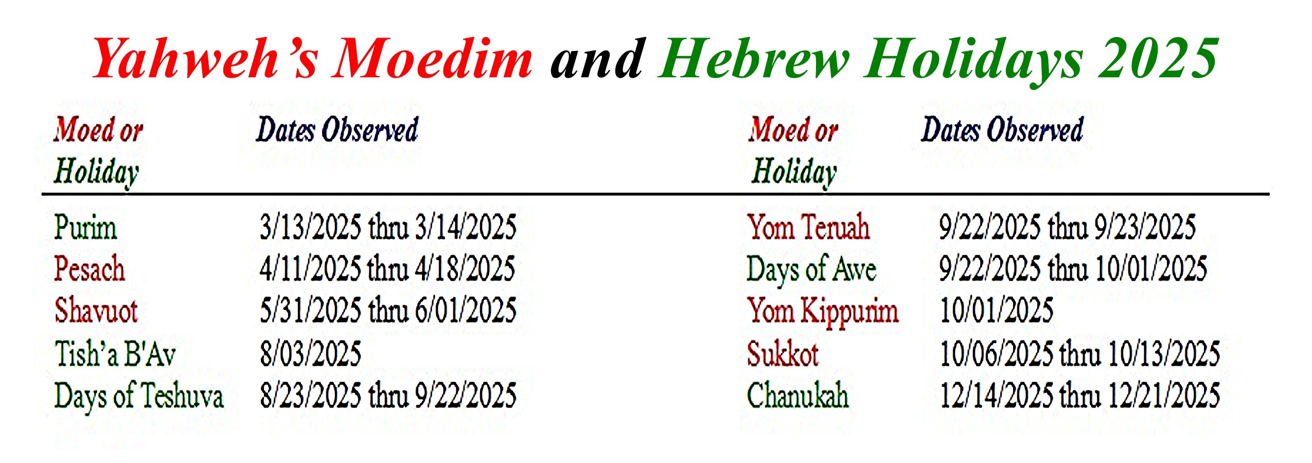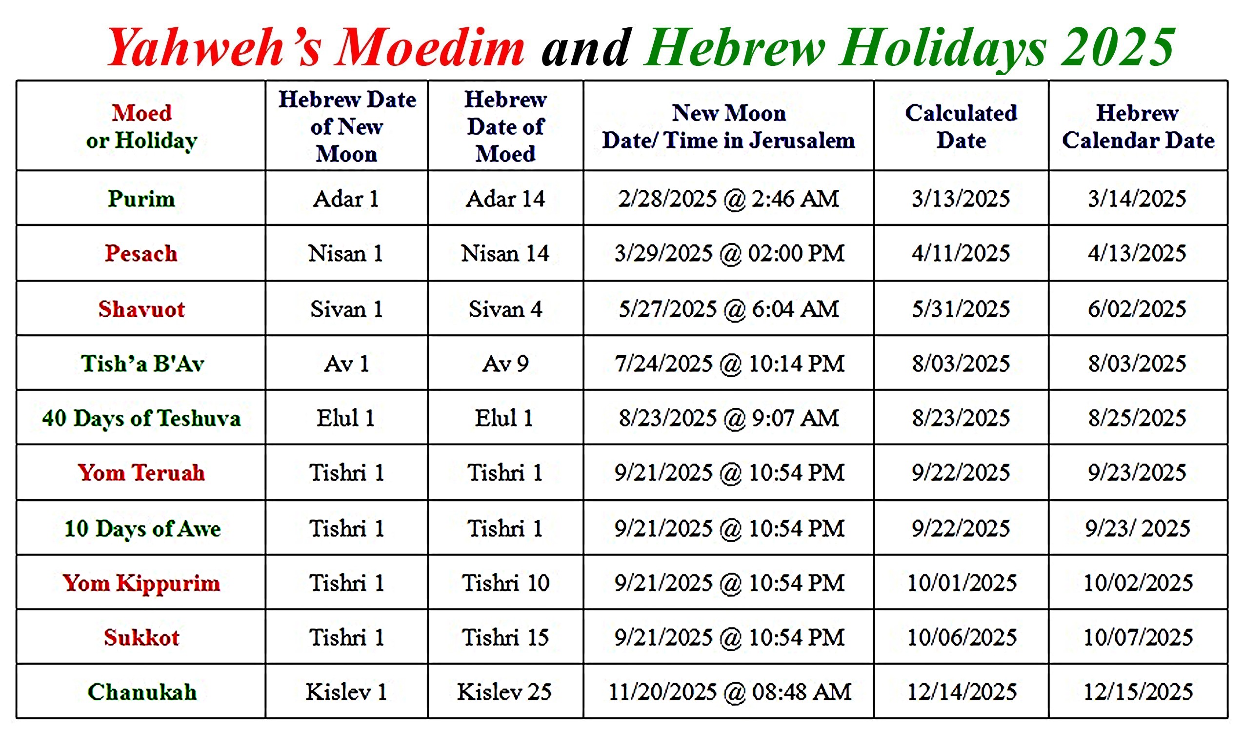 So, what day does one actually pick to celebrate or start a days-long holiday? Our suggestion is to take the date of the New Moon, and count off the number of days needed to get to the date stated by the Bible. For instance, we know that Pesach is always on the 14th of Nisan. Start at Nisan 1, add thirteen days which brings it to the fourteenth day, and use that day to begin the celebration. Below is a chart of the dates that shows that the Hebrew Calendar does not appear to correspond correctly to the new moon dates plus the number of days until the dates of the 2025 Moedim. Also note that when the new moon arrives after 6 PM, on the Hebrew calendar it is actually on the next day, so start counting from the new day’s date!